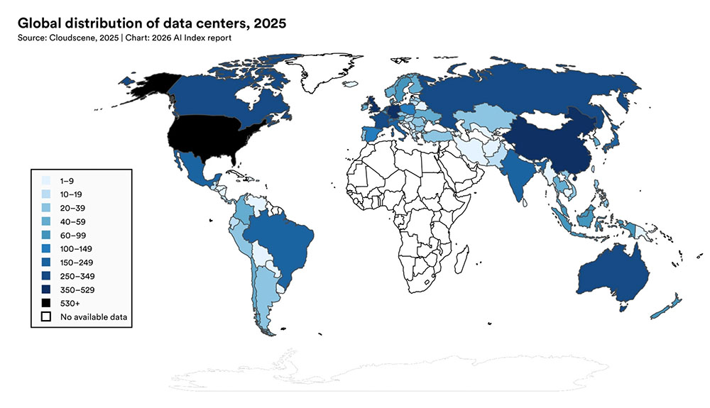 В США расположено 5427 центров обработки данных, что более чем в 10 раз превышает количество центров в любой другой стране. Эти центры потребляют больше энергии, чем любая другая страна мира. Тайваньская компания TSMC производит почти все ведущие чипы для ИИ, что делает глобальную цепочку поставок оборудования для ИИ зависимой от одного завода — хотя расширение производства TSMC в США началось в 2025 году.