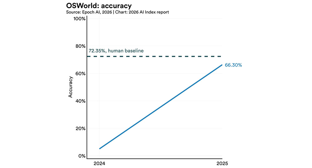 ИИ-агенты совершили скачок с 12% до ~66% успешности выполнения задач на OSWorld, тестирующем агентов на реальных компьютерных задачах в различных операционных системах, хотя они по-прежнему терпят неудачу примерно в 1 из 3 попыток на структурированных тестах.