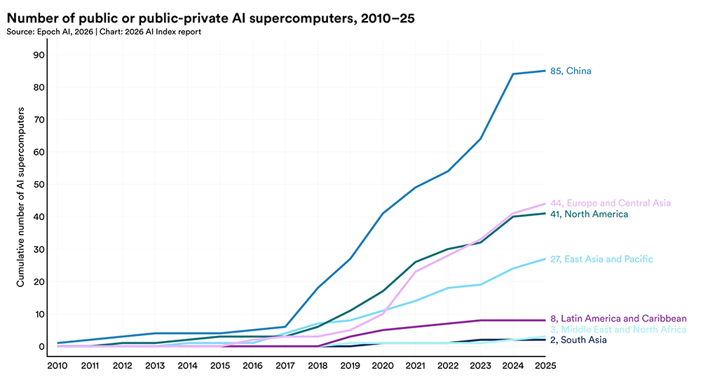 Национальные стратегии в области ИИ расширяются, особенно в развивающихся странах, и параллельно растут государственные инвестиции в суперкомпьютеры для ИИ — признак растущих амбиций по установлению внутреннего контроля над экосистемами ИИ. Тем не менее, разработка моделей по-прежнему сосредоточена в США и Китае. Разработка с открытым исходным кодом начинает перераспределять участие, и вклад остального мира сейчас опережает Европу и приближается к вкладу США на GitHub, способствуя созданию более лингвистически разнообразных моделей и бенчмарков.