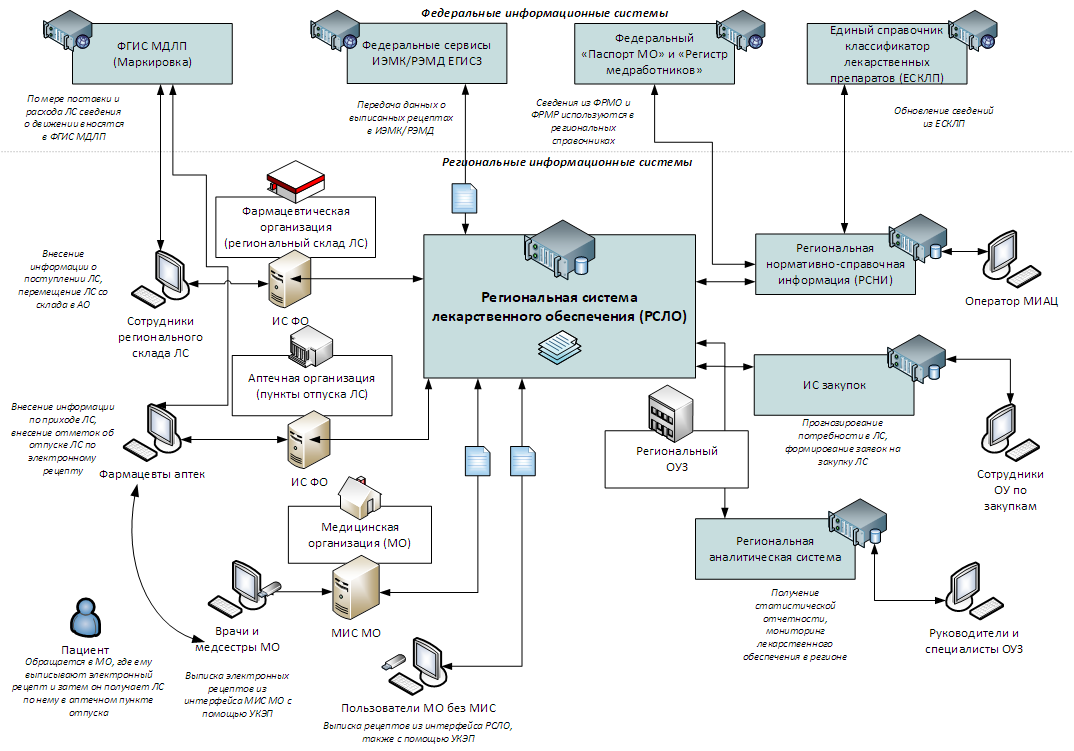 Для ведения электронных рецептов в субъекте РФ должна быть создана соответствующая информационная система обеспечения лекарственными средствами и изделиями медицинского назначения, в том числе льготного лекарственного обеспечения. Такая система может быть представлена как автономным специализированным продуктом, так и являться частью общей региональной медицинской информационной системы (РМИС). Для краткости назовем далее такое решение «Региональной системой лекарственного обеспечения» (РСЛО).