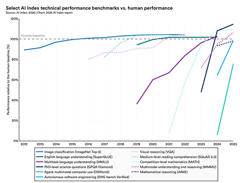 Более 90% значимых передовых моделей были созданы в 2025 году, и некоторые из этих моделей теперь соответствуют или превосходят базовые показатели человека в решении научных задач, многомодальном рассуждении и математике на уровне доктора наук.