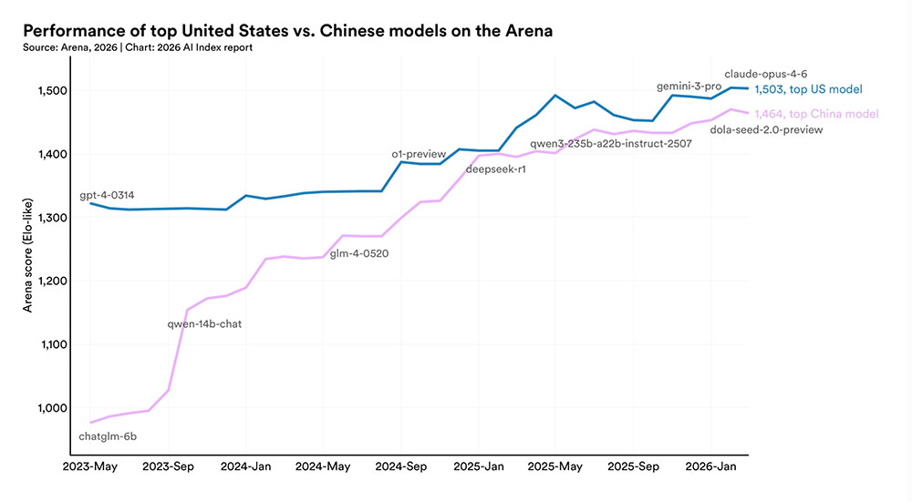 В феврале 2025 года DeepSeek-R1 ненадолго сравнялся с лучшей американской моделью, а по состоянию на март 2026 года лучшая модель Anthropic опережает всего на 2,7%. США по-прежнему производят больше высококачественных моделей ИИ и патентов с высоким влиянием, в то время как Китай лидирует по объему публикаций, цитирований, количеству патентов и внедрению промышленных роботов. Южная Корея выделяется своей плотностью инноваций, лидируя в мире по количеству патентов на ИИ на душу населения.