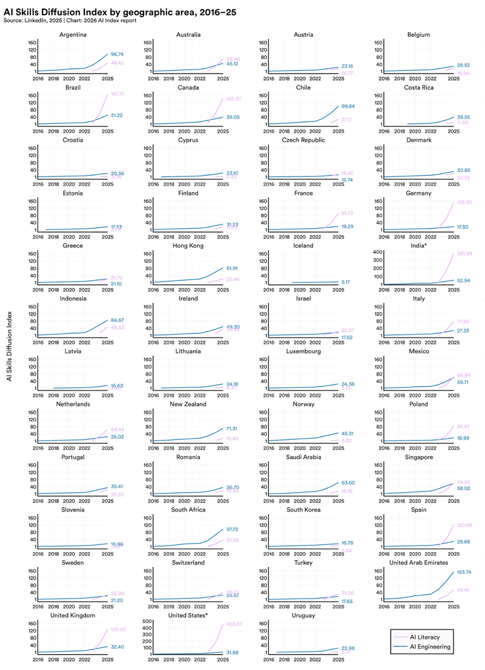 Более 80% американских старшеклассников и студентов колледжей сейчас используют ИИ для выполнения школьных задач, но только половина средних и старших школ имеют политику в отношении ИИ, и лишь 6% учителей говорят, что эта политика понятна. За пределами класса навыки в области инженерии ИИ быстрее всего развиваются в Объединенных Арабских Эмиратах, Чили и Южной Африке. Число новых докторов наук в области ИИ в США и Канаде увеличилось на 22% с 2022 по 2024 год, причем эти доктора наук устроились на работу в академические круги, а не в промышленность.